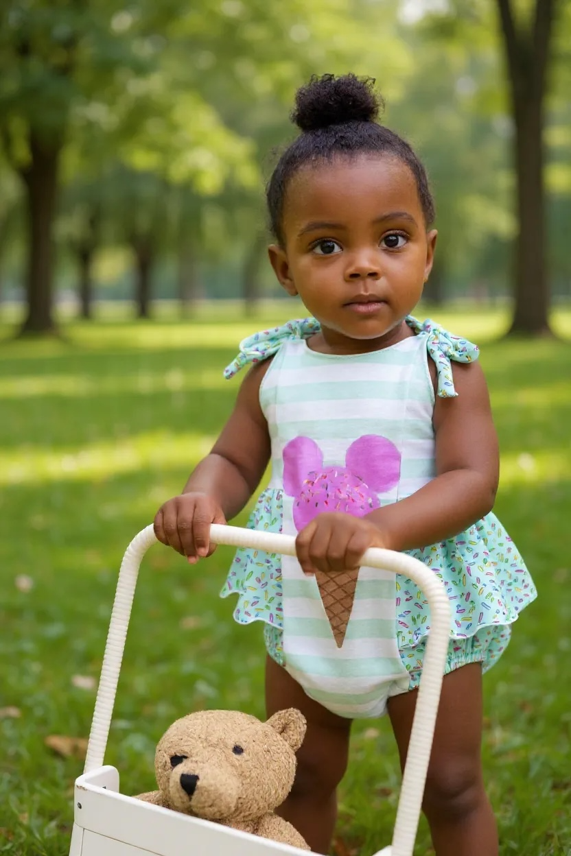 Sweet and playful, this custom-made romper is perfect for your little one’s summer adventures! Featuring a whimsical ice cream cone design with sprinkle accents, this romper combines comfort and cuteness in one. The mint-green striped bodice pairs beautifully with sprinkle-print ruffles and ties at the shoulders for an adjustable fit.